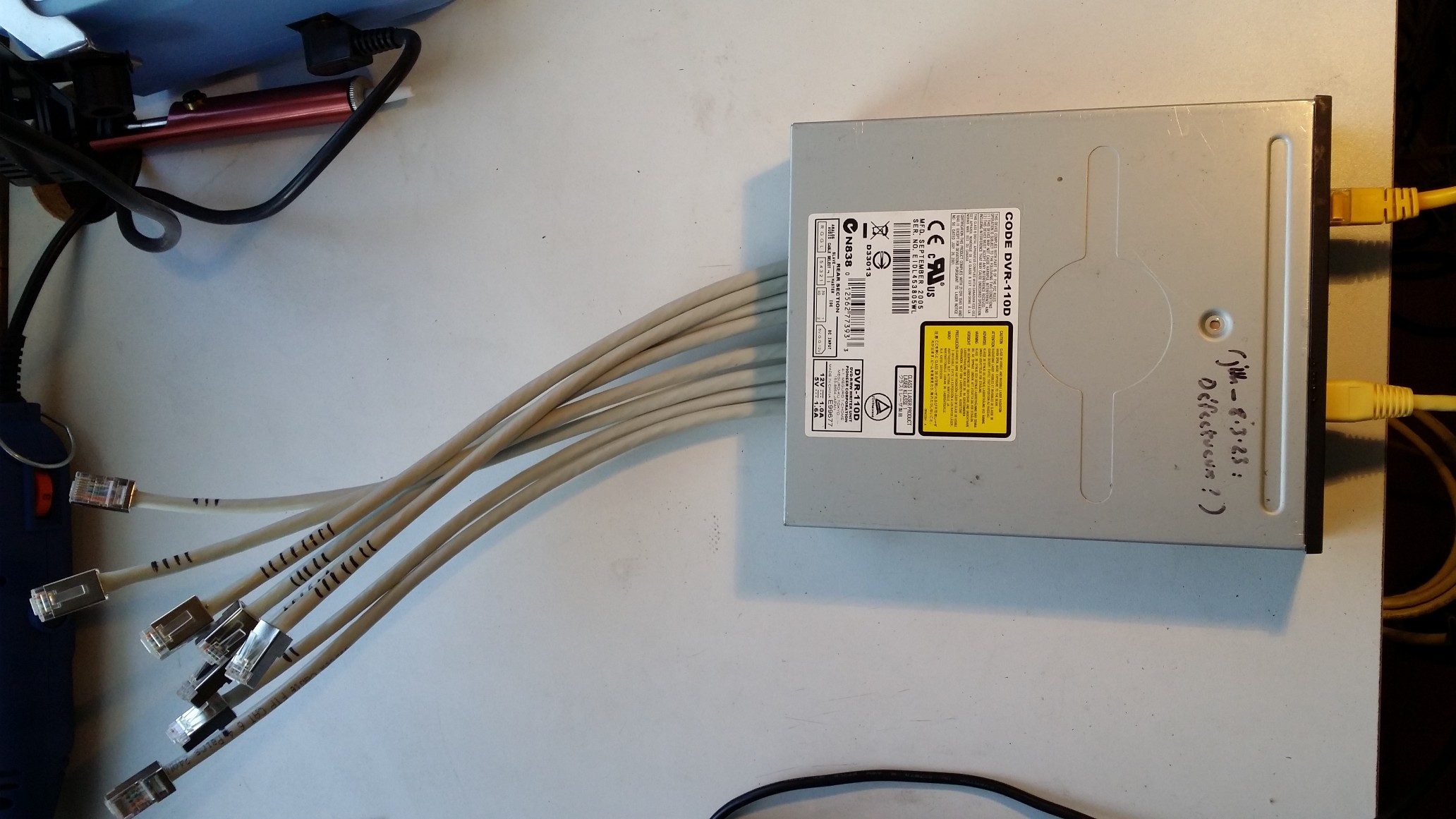 Après avoir dépouillé le lecteur DVD, serti des câbles de 50 cm de long d’un côté et les enficher dans le panneau de l’autre, voici le résultat :